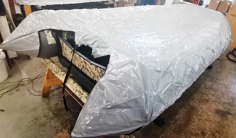 Транспортировочный тент с фальшбортом покрывает как верхнюю часть лодки так и всё судно включая его борт. Для хранения на длительный период обычно используют тенты, покрывающие всё судно, во избежание случайных нежелательных воздействий, результатом которых могут стать царапины на борту. Ткань изделия из ПВХ материала. Вес: 5-6 кг.