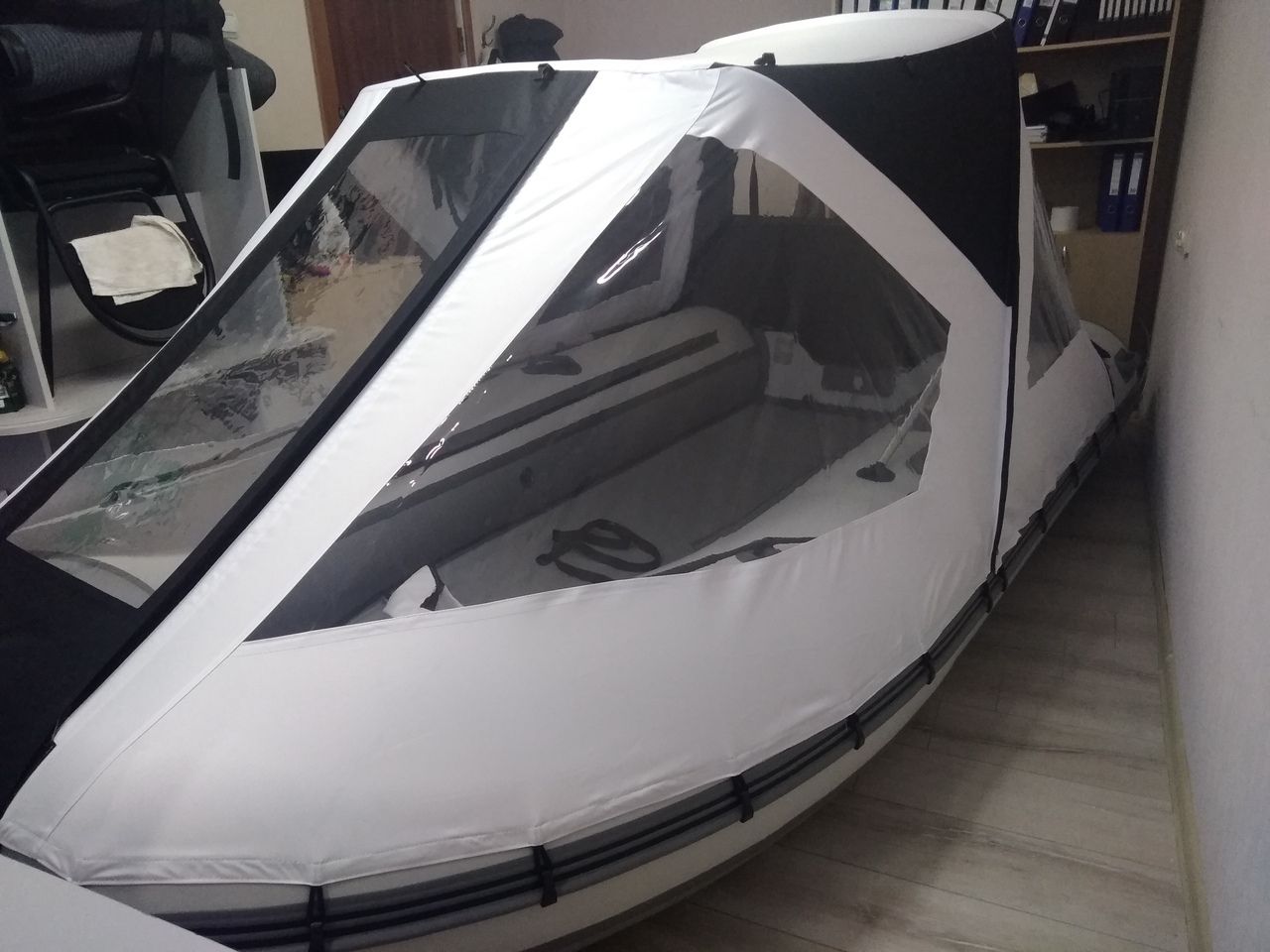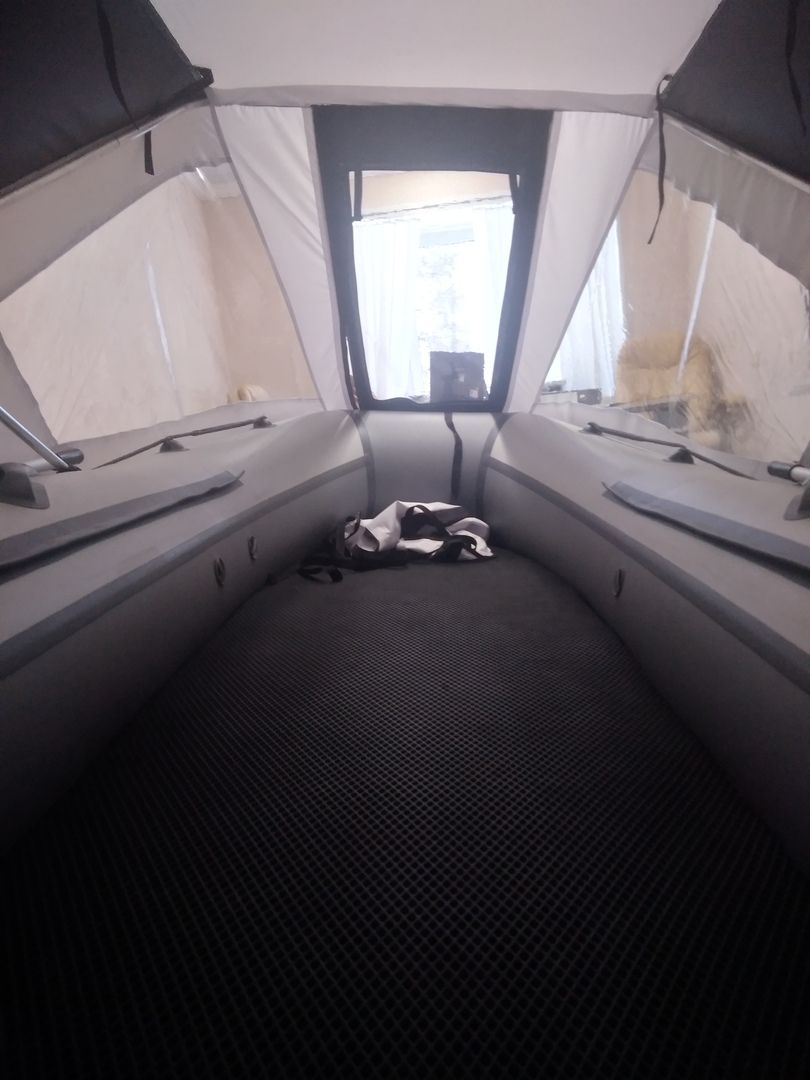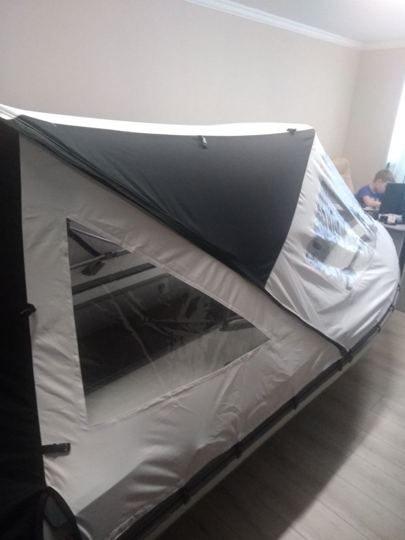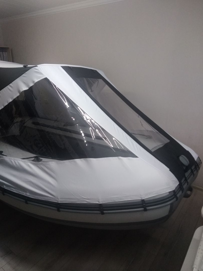 Этот тент закрывает полностью пространство лодки, как палатка и его можно трансформировать - открывая или закрывая любые из сторон тента полностью или частично. тем самым быть как палатка или как навес/крыша.