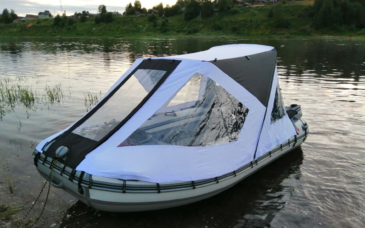 Тент-трансформер состоит из прочного металлического каркаса, влагостойкой тентовой ткани (Оксфорд) и ткани ПВХ (прозрачные окна). Для установки тента в комплекте идут опоры, крючки и инструкция по установке и эксплуатации. Большие смотровые окна, позволяют передвигаться по воде на дальние расстояния даже в ненастную погоду. Для вентиляции предусмотрены воздушные клапаны. Упаковывается тент в практичную сумку.